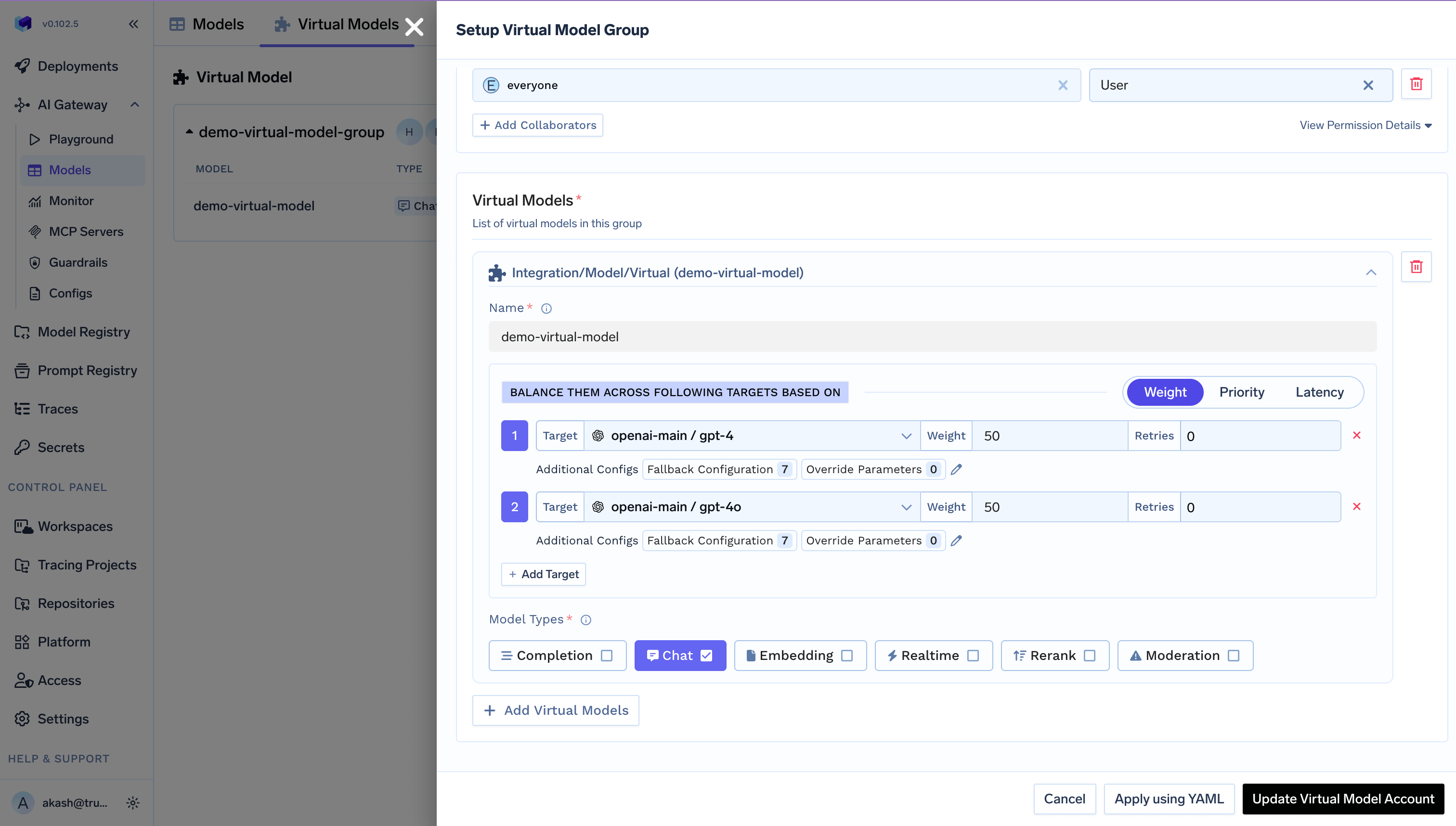Create reusable virtual models with intelligent routing configurations to distribute requests across multiple model providers. Read more