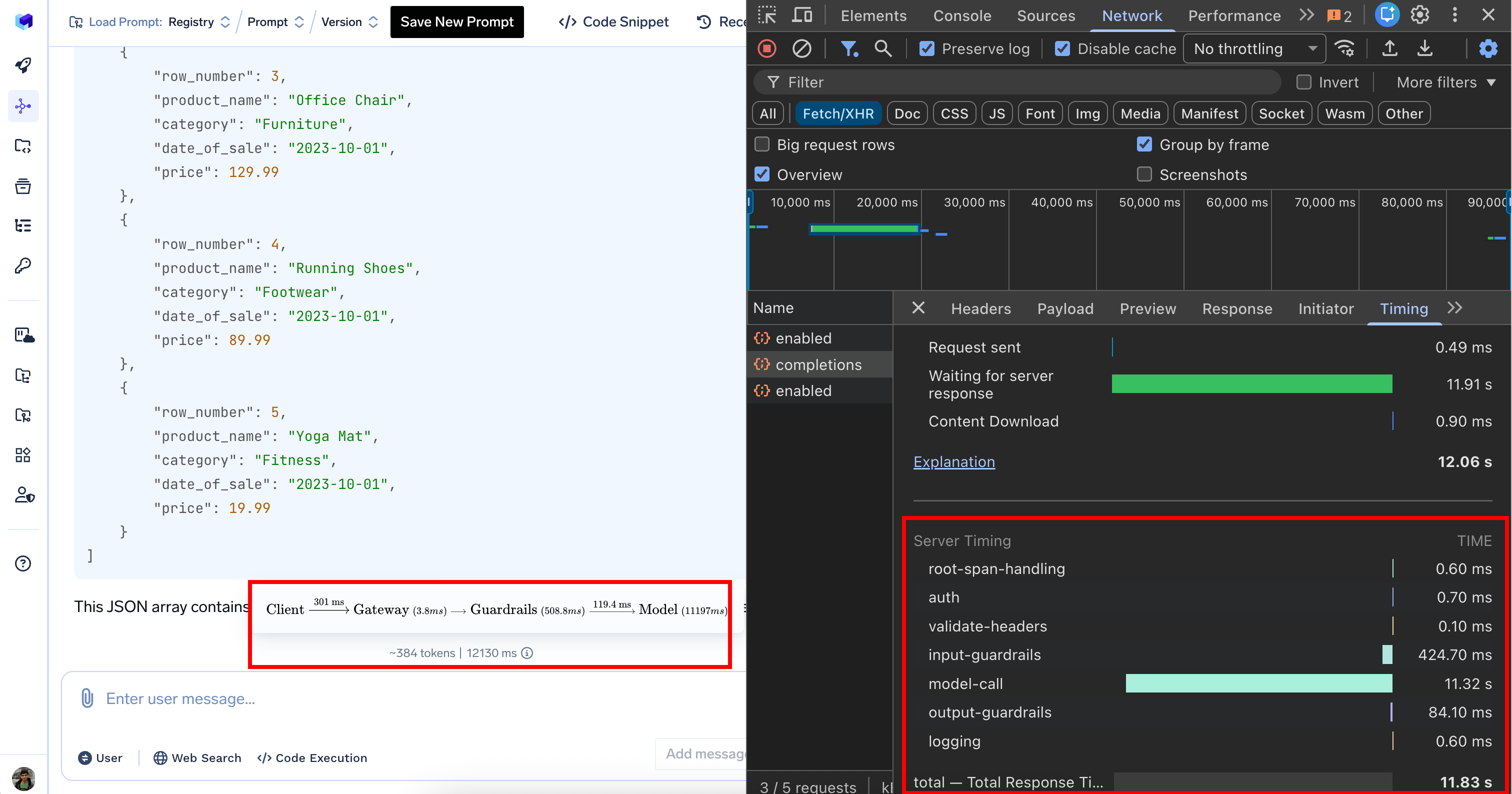 server-timingFor non-streaming requests only. Contains timing information for different processing stages including middlewares, guardrails, and model calls