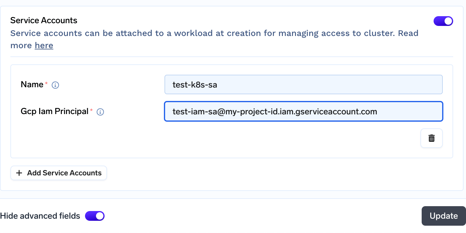 + Add Service Accountsto add a Serviceaccount- Enter the name of your Kubernetes Serviceaccount which is in the variable $APP_SA