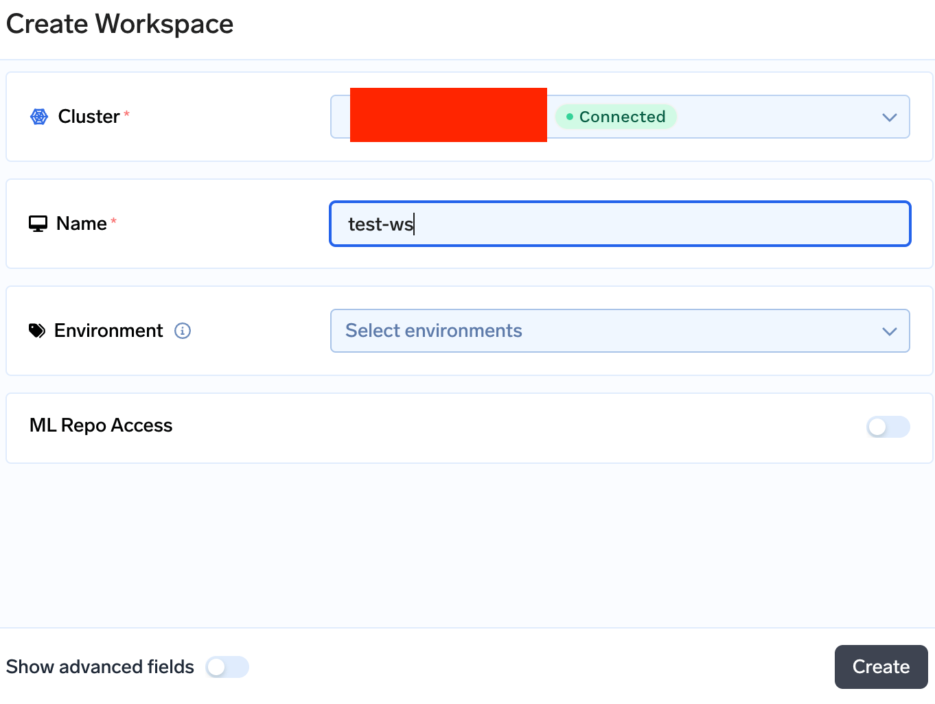 + New Workspaceto create a new workspace. If you already have a workspace created click on the Edit section from the right side of the workspace card. - Select the cluster where you want to create the serviceaccount and enter the name of the workspace (namespace).