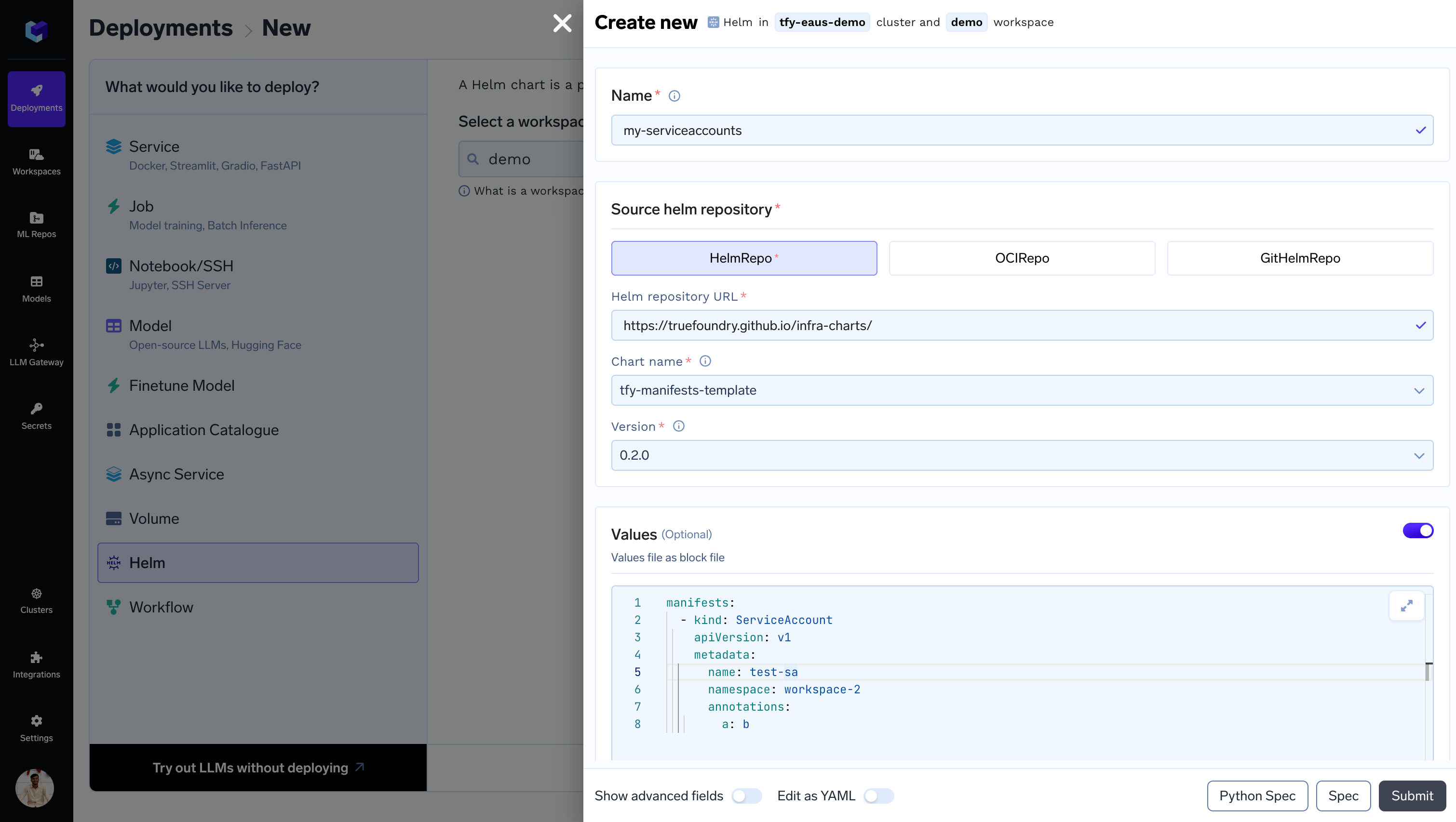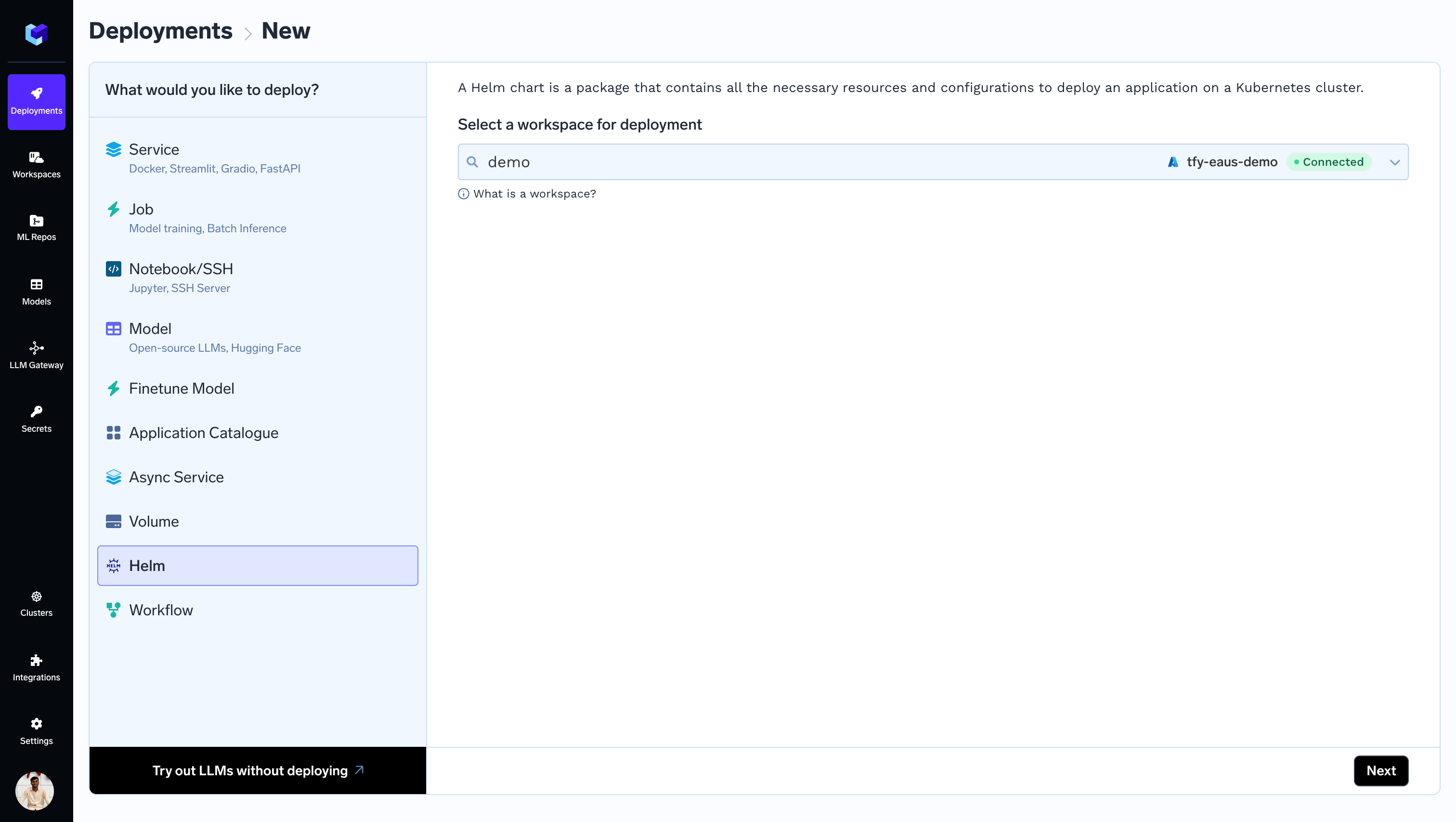 New DeploymentForm. SelectHelmfrom the left navbar and then select yourworkspace