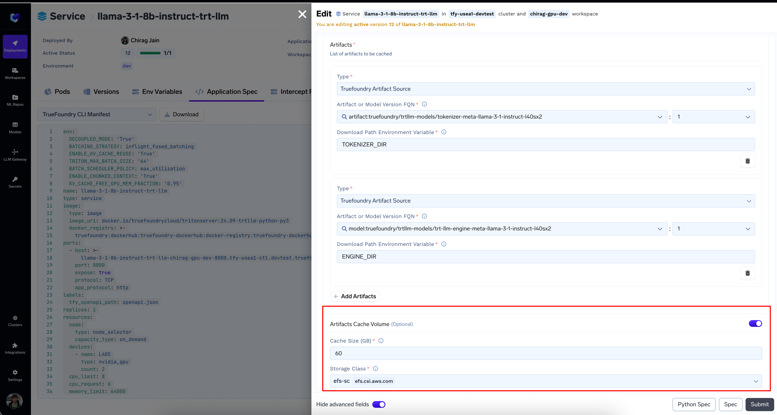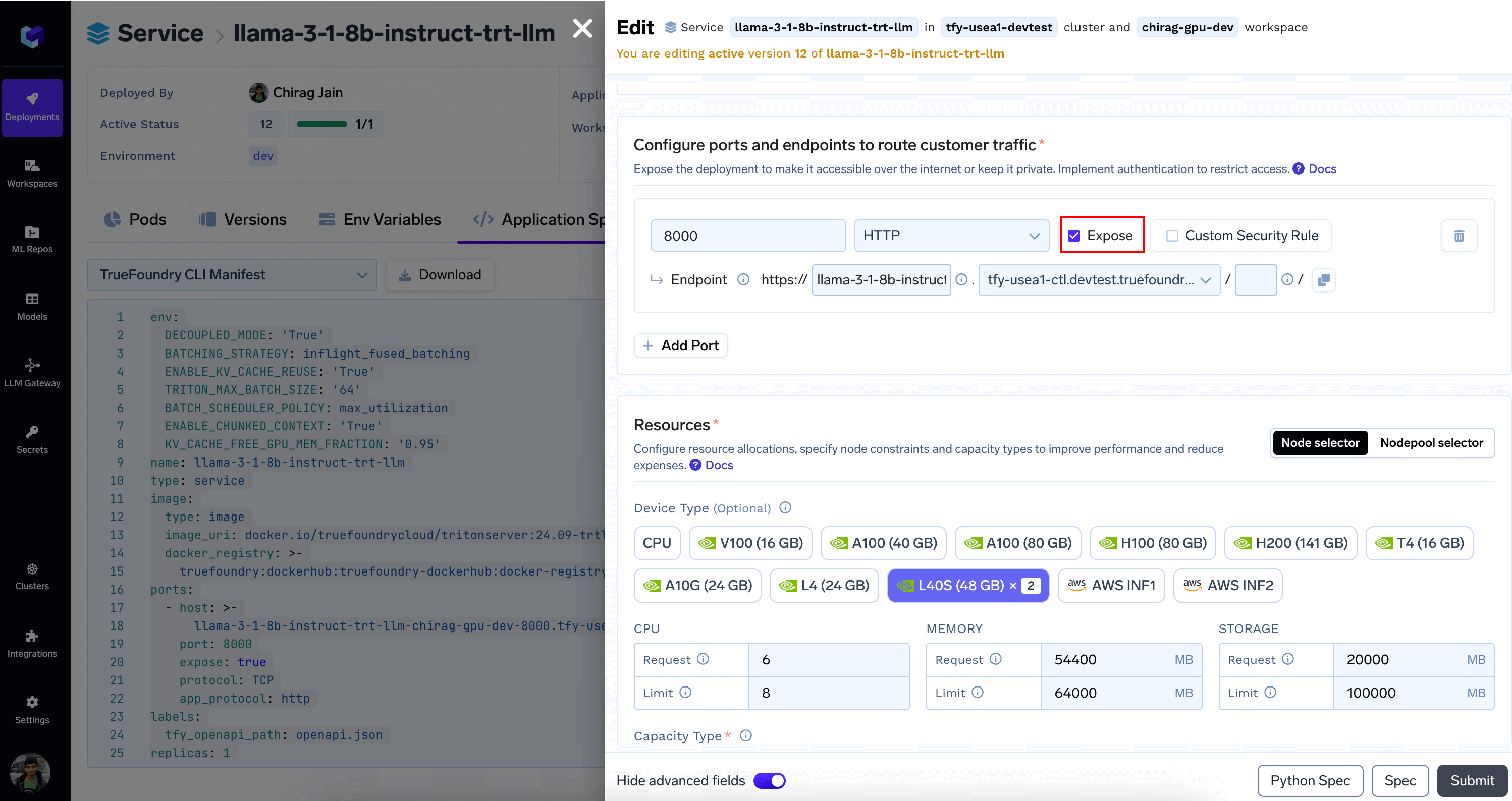 Finally, let’s deploy the engine using Nvidia Triton Server as a TrueFoundry Service. Here is the spec in full:resources section varies across cloud provider