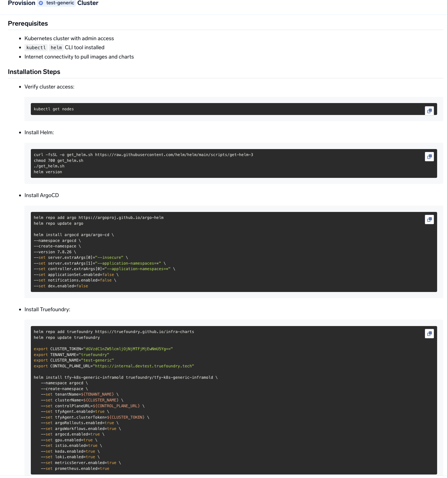 TrueFoundry compute plane infrastructure, for generic cluster, is provisioned using helm. You can download the helm commands and execute them on your cluster.1