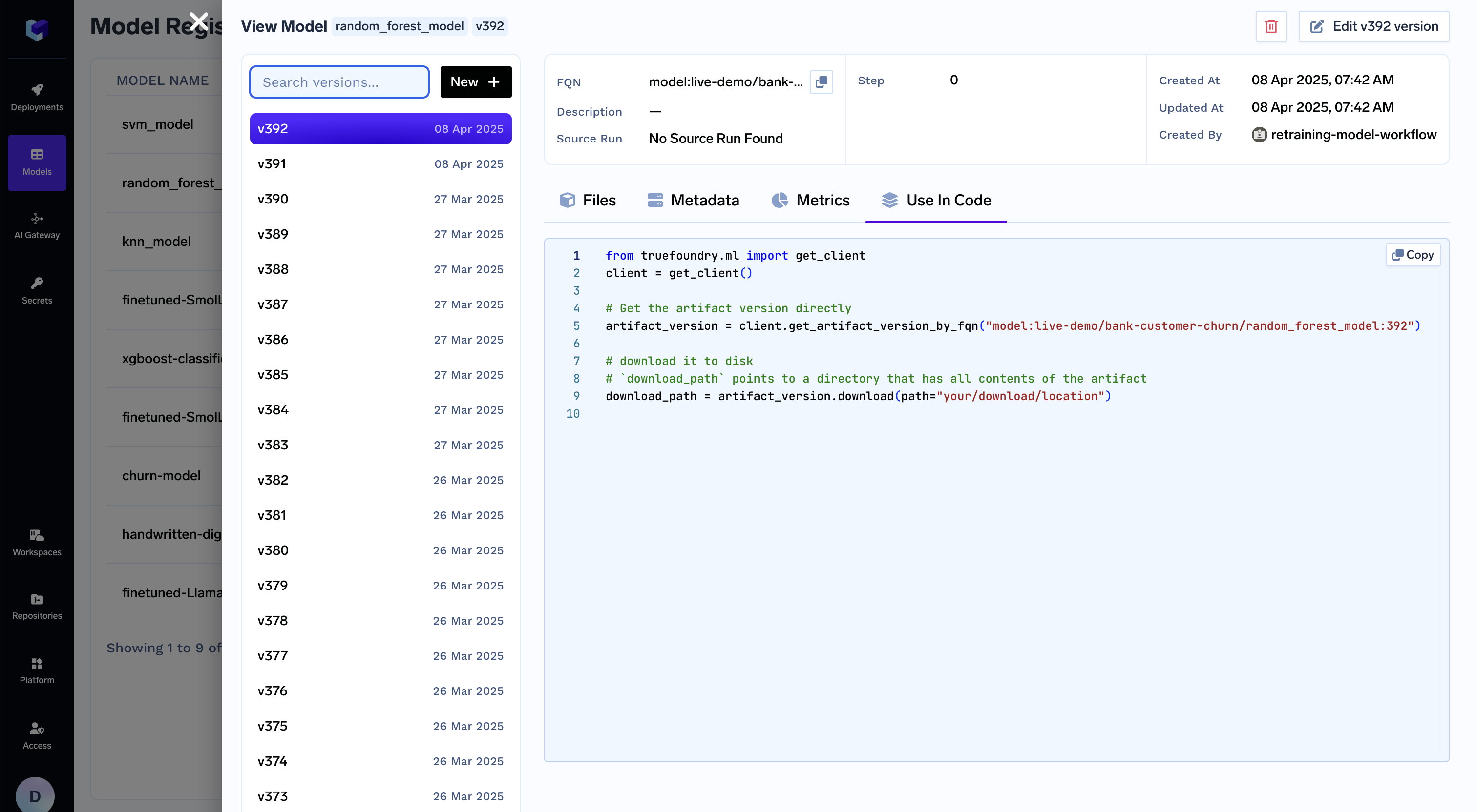 For every model version, you can find the code to download it in your inference service.