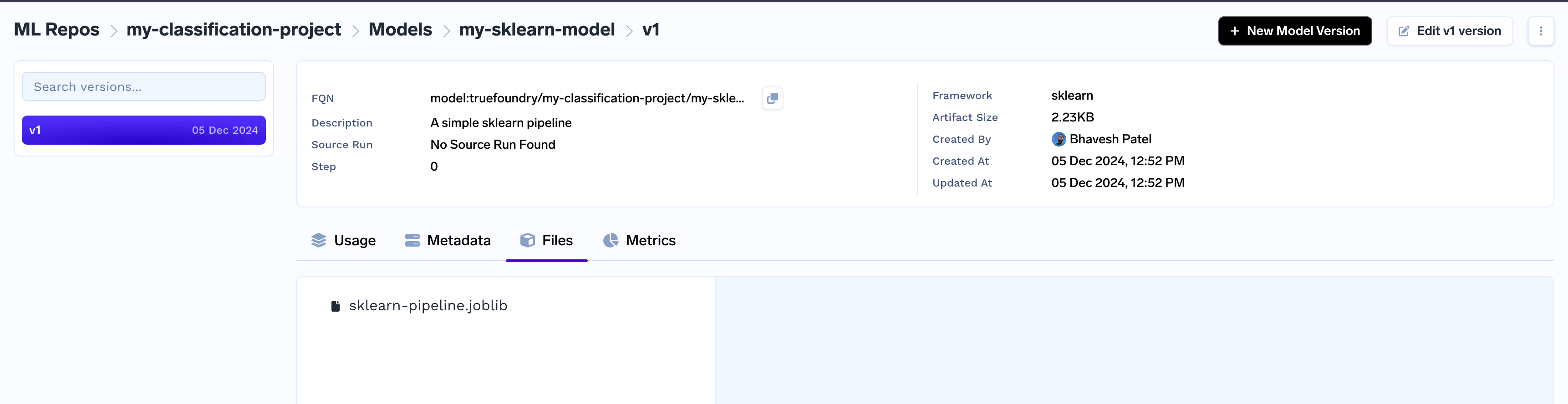 Once a model version is created, the model version files are immutable. Only fields like description, framework, metadata can be updated using CLI or UI.