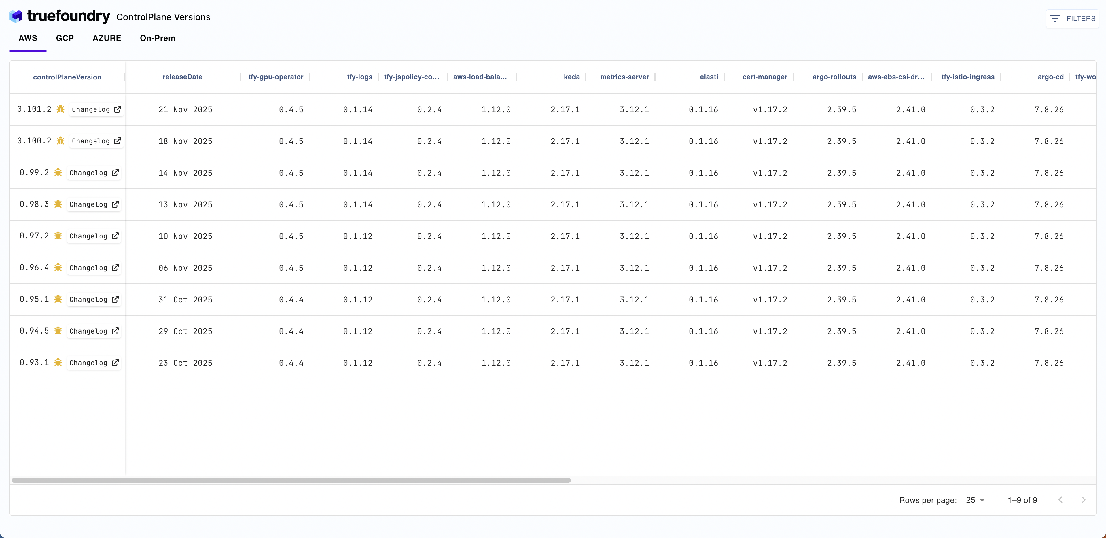 The control-plane is compatible with older versions of the compute-plane unless mentioned in the changelog. We do however have a recommended version of the different components of the compute-plane that you should try to maintain since that is the most tested configuration that we maintain. You can track the dependencies here: https://releases.truefoundry.com/control-plane-versions This will highlight the versions of ArgoCD, GPU Operator, and other addons that the control-plane version is tested with.