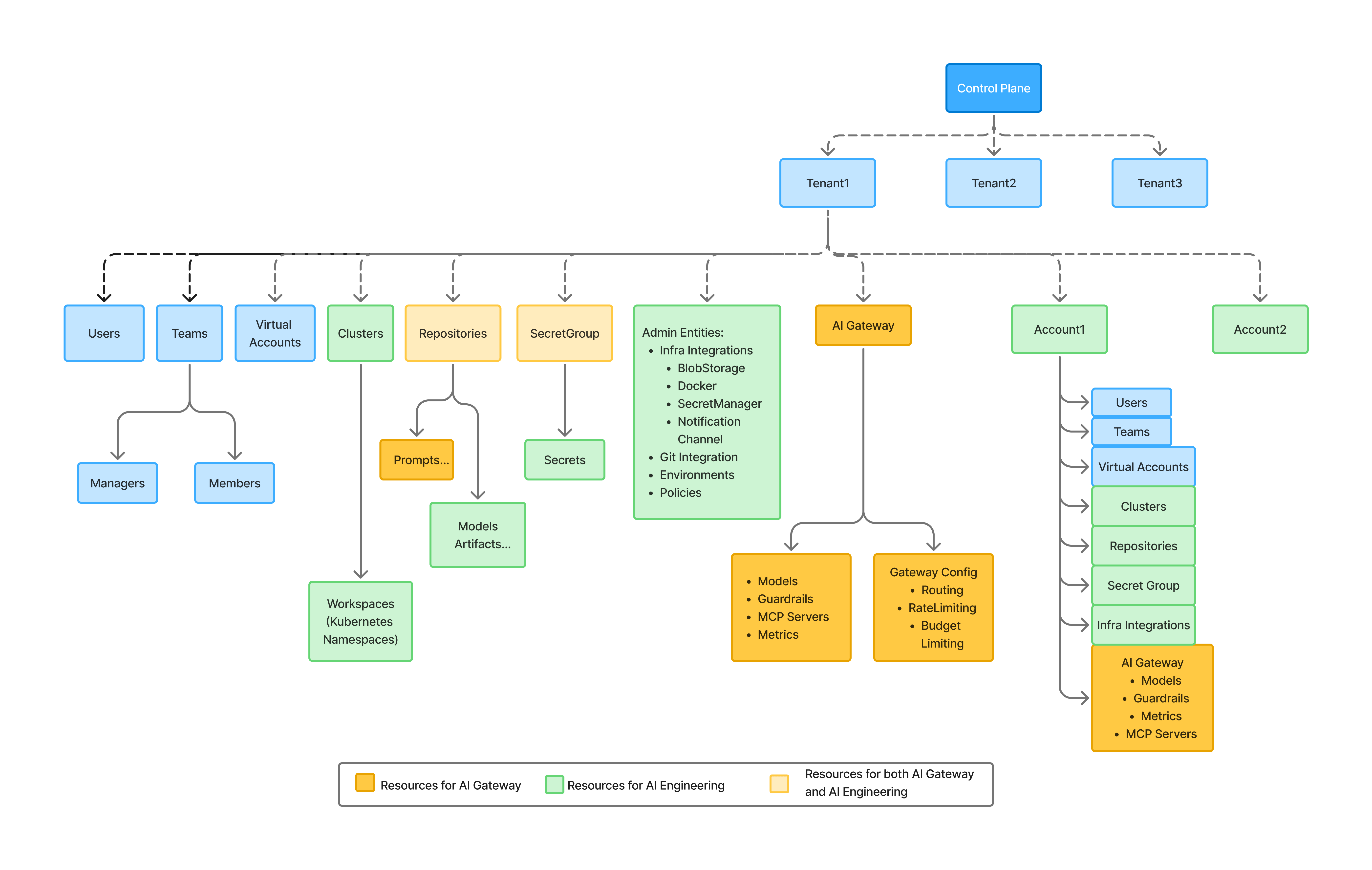 - AI Gateway: Tenant-admin (Platform) team creates a model provider account and allots different models to different accounts. For example account1/team1 has access to model1, account1/team2 has access to model2, etc.