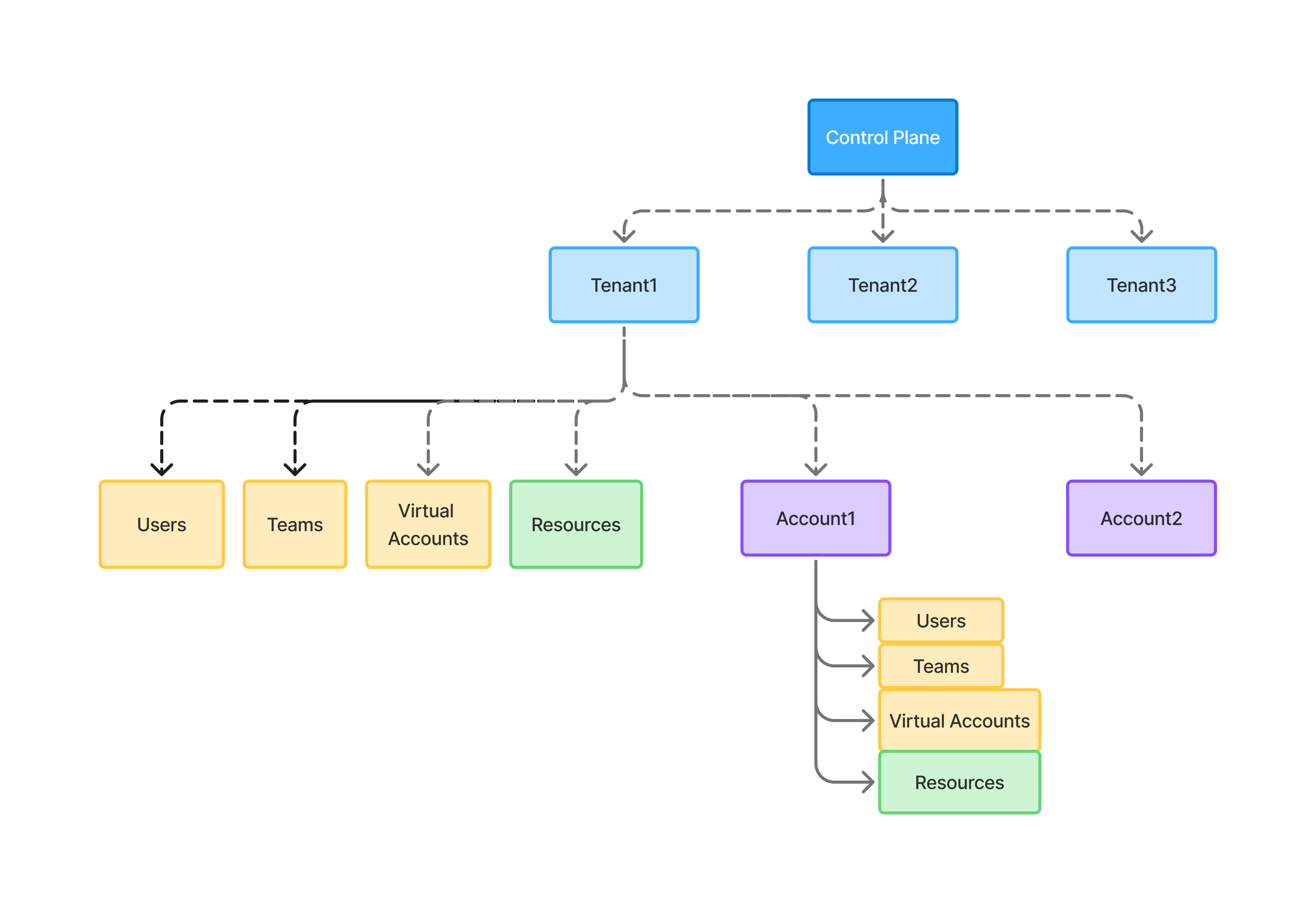 - Tenant-Level Resources: These are the resources that can be created directly under the tenant. These resources can be used and managed by teams/users/virtual accounts at the tenant level. In most cases, just creating resources at the tenant level and alloting them to different teams/users is enough and we don’t need to create accounts within a tenant.