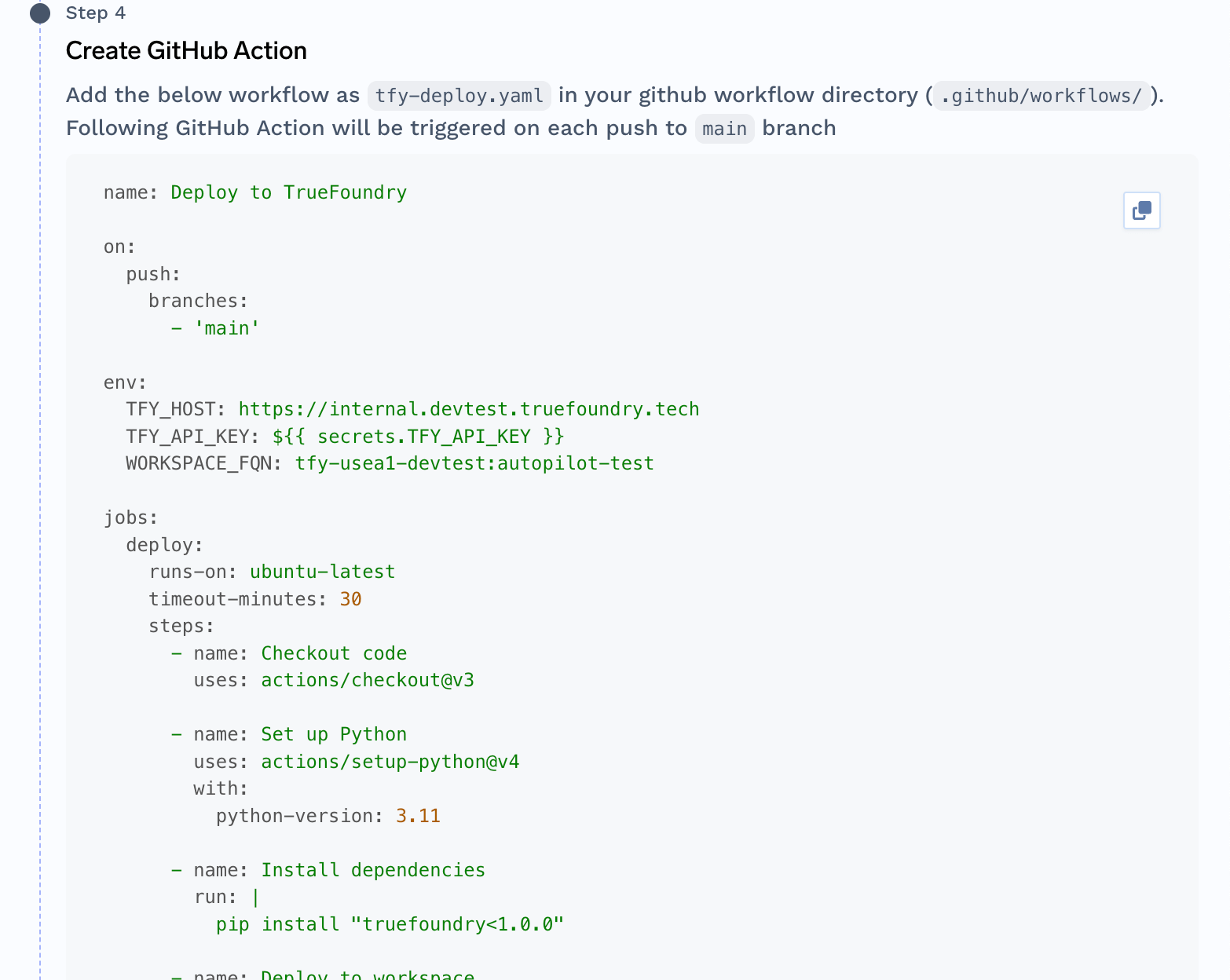 TrueFoundry provides a simple setup process that generates the appropriate CI/CD configuration based on your preferences.1