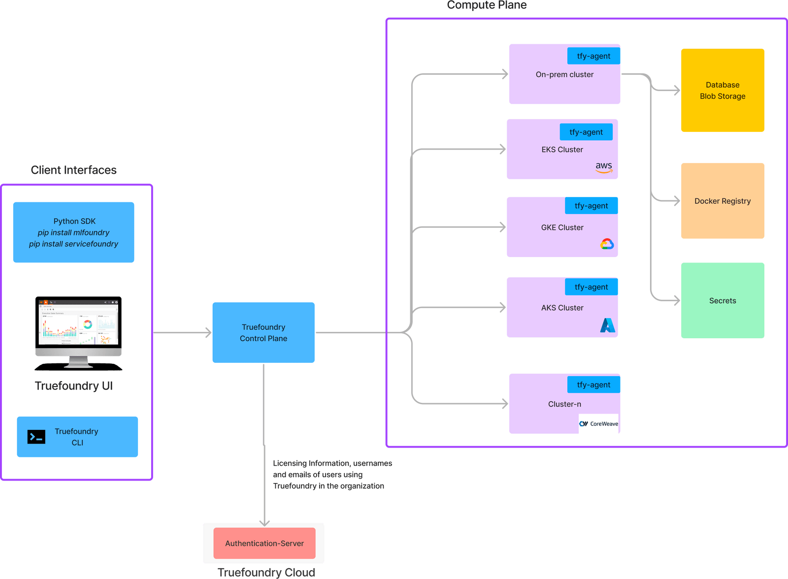 TrueFoundry hosts a multi-tenant control plane which can orchestrate deployments across multiple compute-planes. In this case, you create a Kubernetes cluster in your own cloud account and connect it to the hosted control plane. The connection is done via installing the tfy-agent in your own kubernetes cluster which helps it connect to the hosted control plane. In this case, all compute and data stays in your own cloud environment - however the control plane has access to fetch the artifacts and logs of your applications. This is a more managed setup wherein the upgrade of TrueFoundry is automatically handled by the TrueFoundry team. To understand all the steps involved in connecting cluster to control plane, you can read Deploy Compute Plane.Both compute and control plane in your own cloud environments (Enterprise Plan)