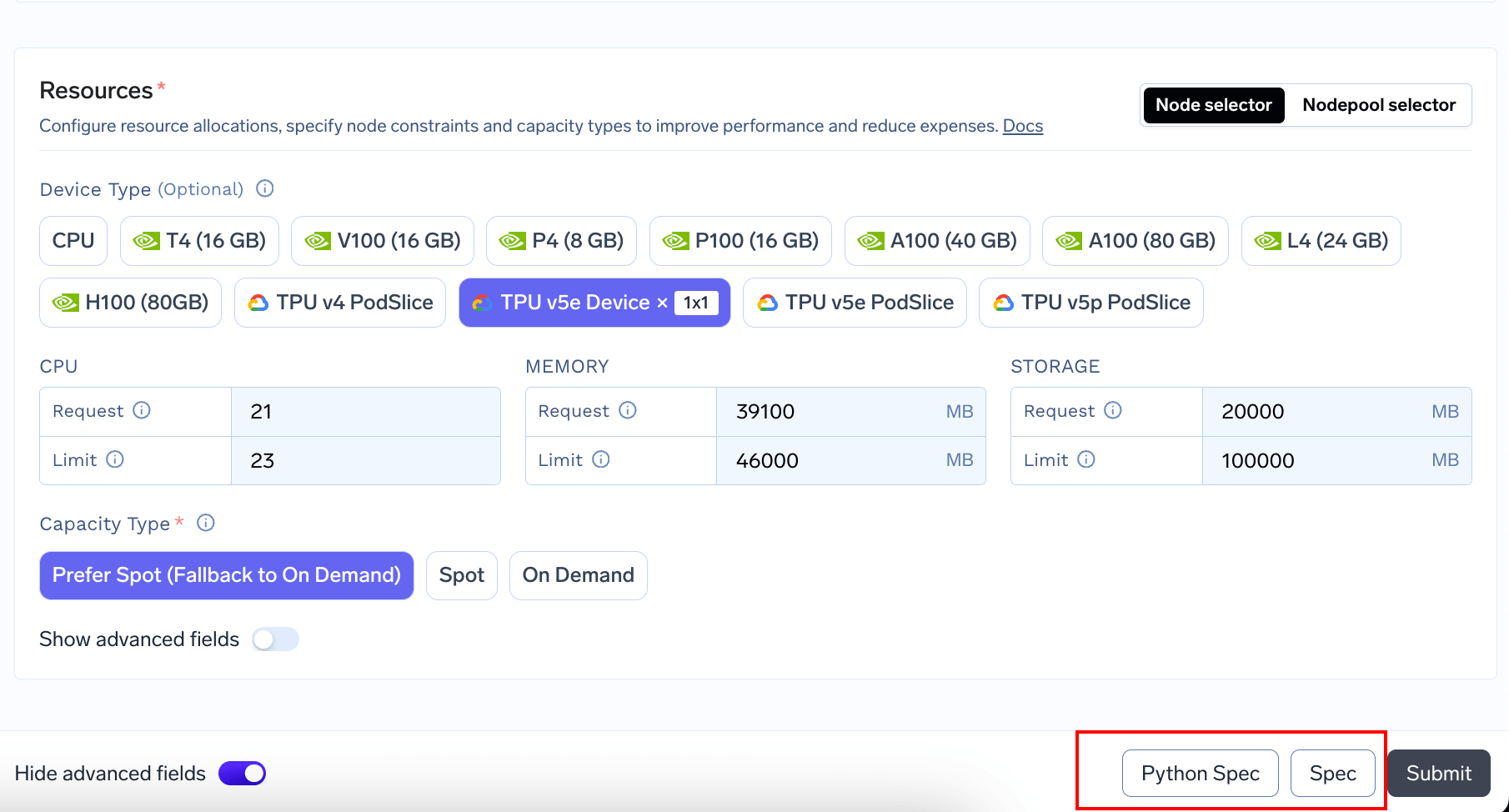 You can add TPUs to your Service / Job / Notebook / SSH Server by simply selecting a TPU Type and a topology from the Resources section