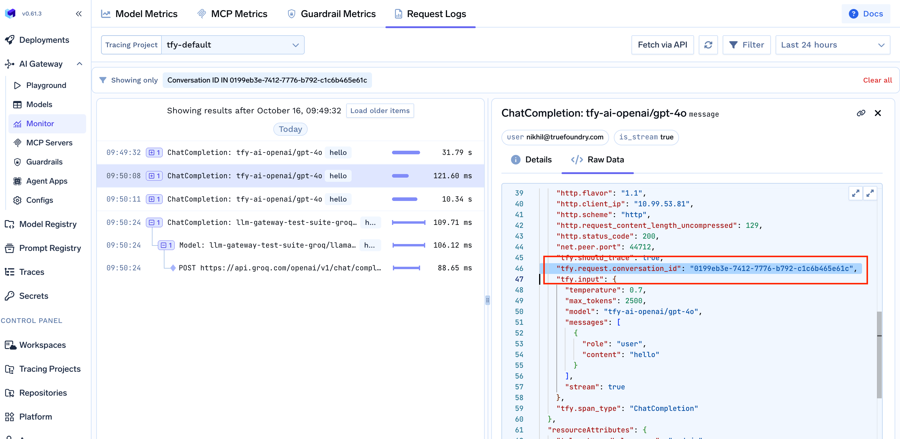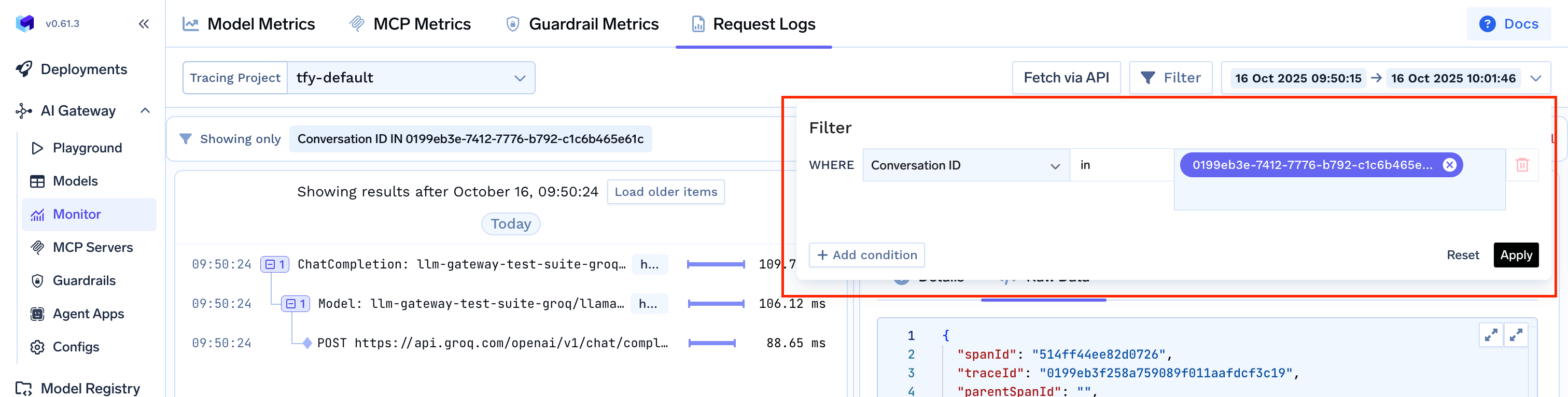 Once you’ve tagged requests with conversation IDs, you can filter them in the TrueFoundry UI’s request logs section. This allows you to:- View all API calls within a specific conversation